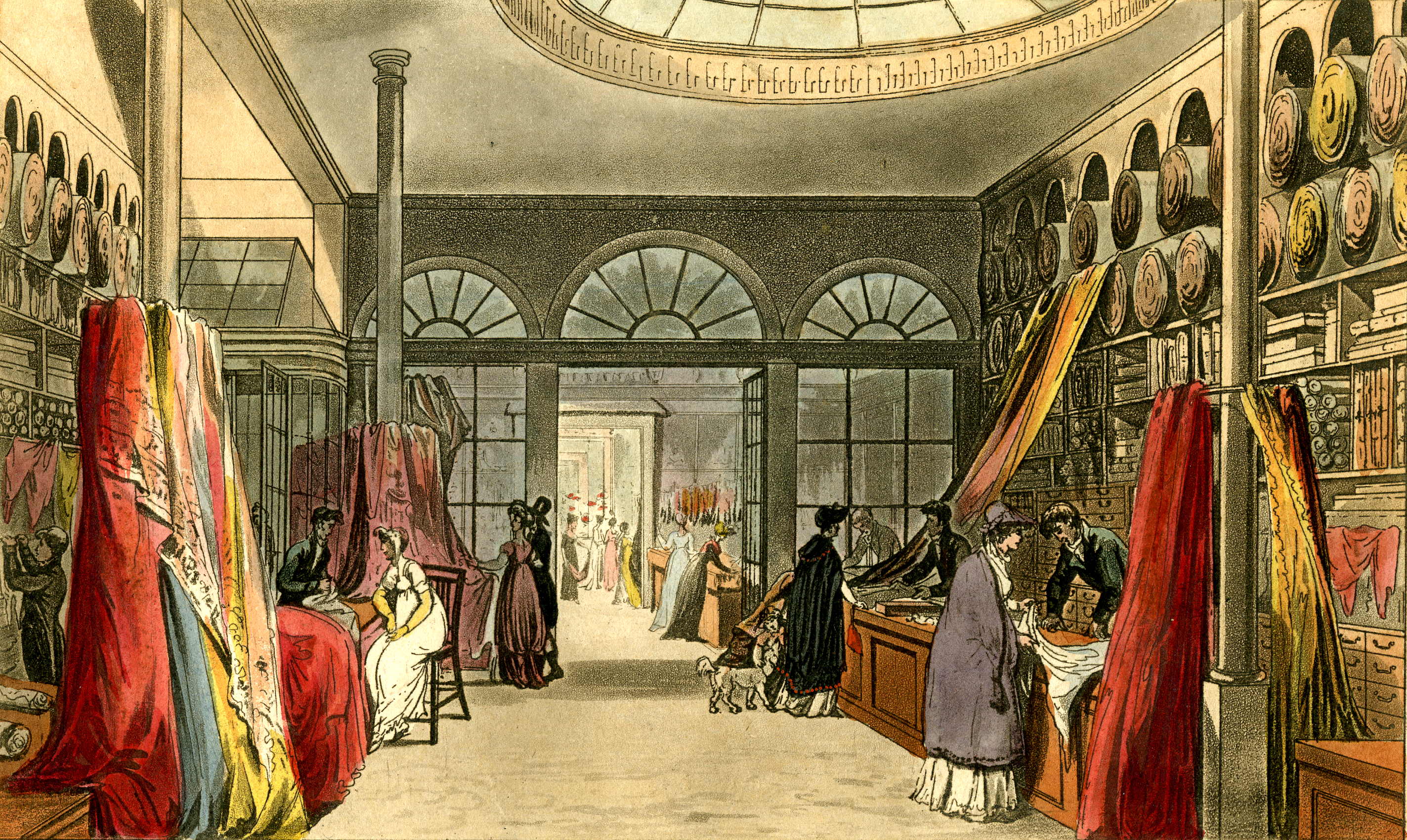 According to Ackermann’s Repository, which is where the illustration below appeared, ‘It is fitted up with great taste, and divided by glazed partitions into four departments.’ These were: furs and fans; ‘haberdashery of every description, si