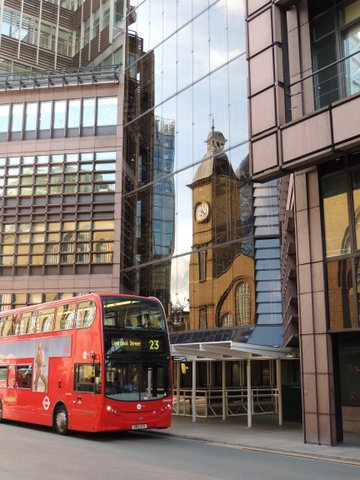 My favourite journey through London’s historic streets isn’t from  a tourist bus but from the front seat on top of the ordinary number 23 from Liverpool Street 1-DSCN2030station to Marble Arch. I thought you might like to share the ride with me. If you do decide to try this trip I would recommend starting from Liverpool Street station, perhaps after a morning exploring the fascinations of the Spitalfields area on the other side of the station. The picture on the left shows the bus with the yellow brick of the station reflected above it