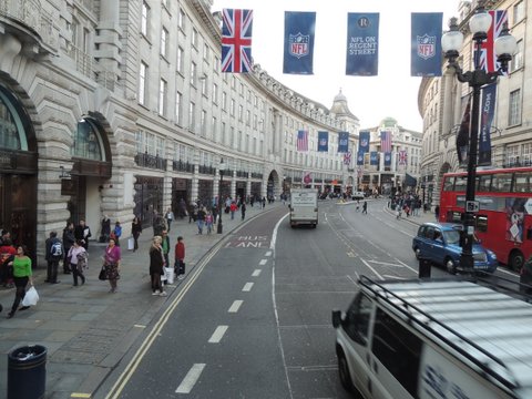 We pass the foot of Haymarket – home to the market selling, amongst other things, hay and fodder for London’s thousands of horses. It was also notorious for its prostitutes – Haymarket Ware. The bus crosses Waterloo Place and turns up Regent Street. Behind us is the Duke of York’s Column, overlooking St James’s Park. All along that side of Pall Mall stretched Carlton House, once intended to be the culmination of Nash’s dramatic Regent’s Street redevelopment begun in 1816. But Carlton House was demolished in 1826 after the Regent became George IV and moved into Buckingham Palace. All Nash’s original buildings have been replaced as the requirements for modern shops have changed, but the scale and the style remains much as he envisaged.  The new street cut though London, separating the squalor of Soho to the east from the riches of fashionable Mayfair to the west.