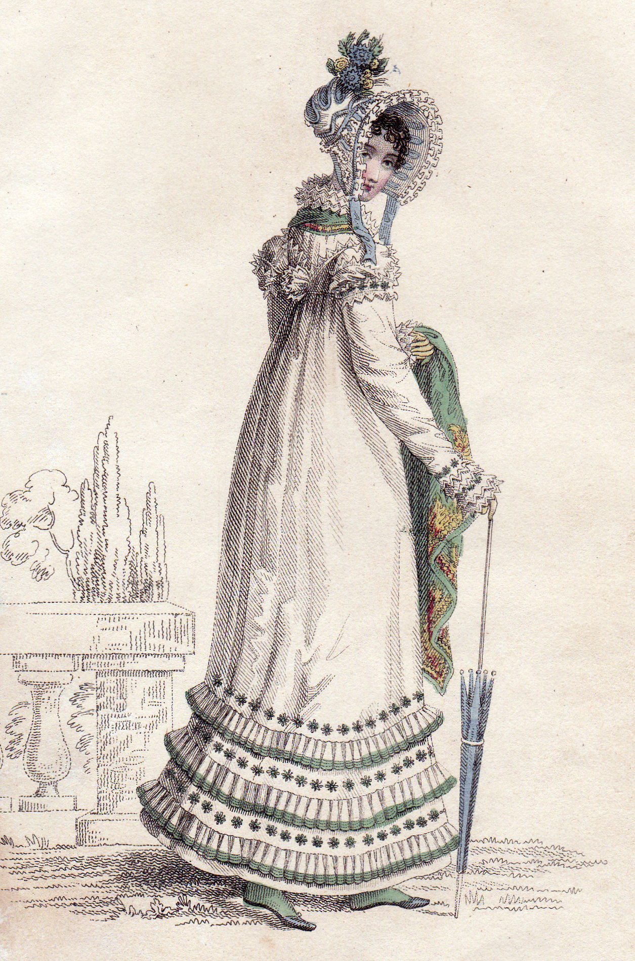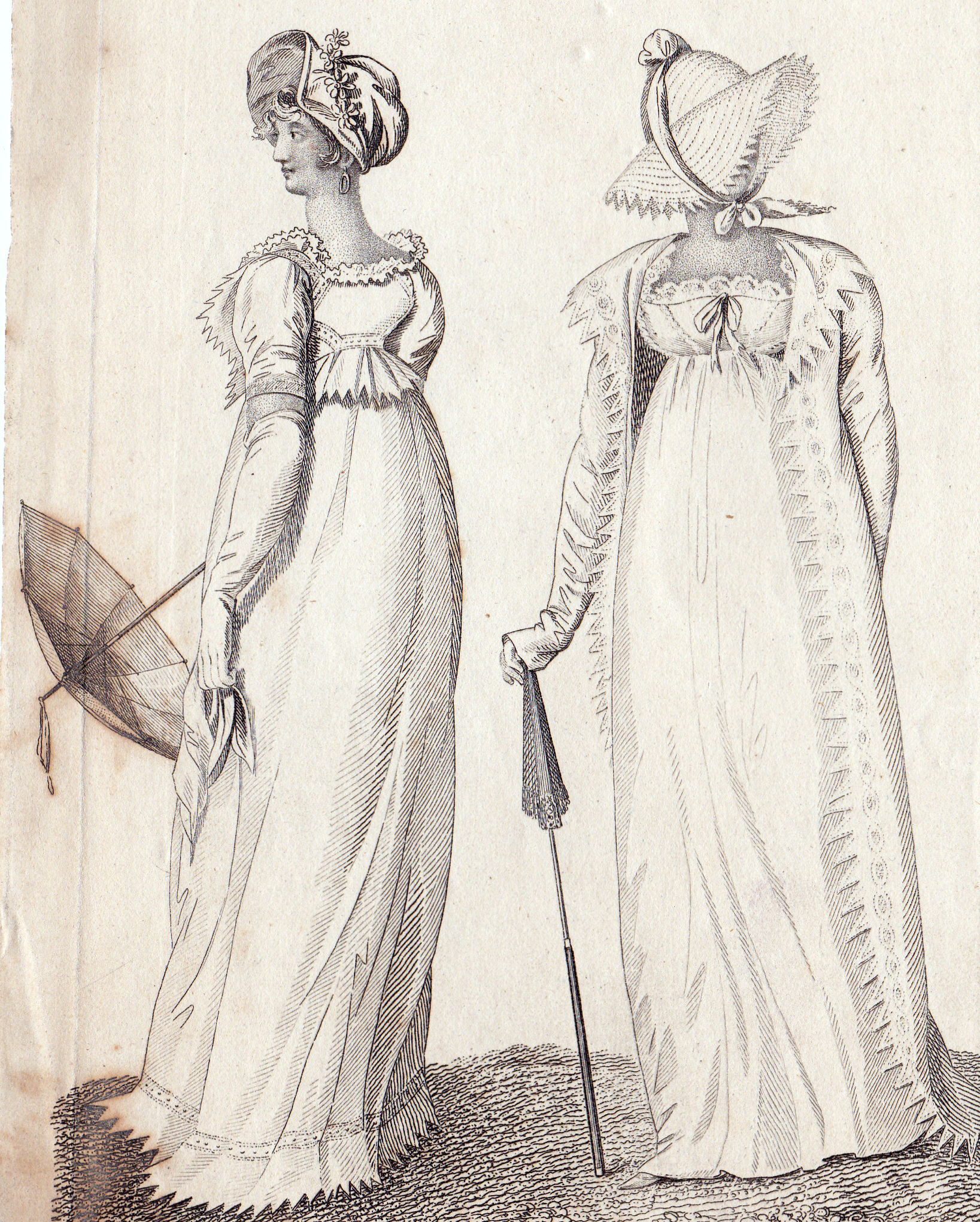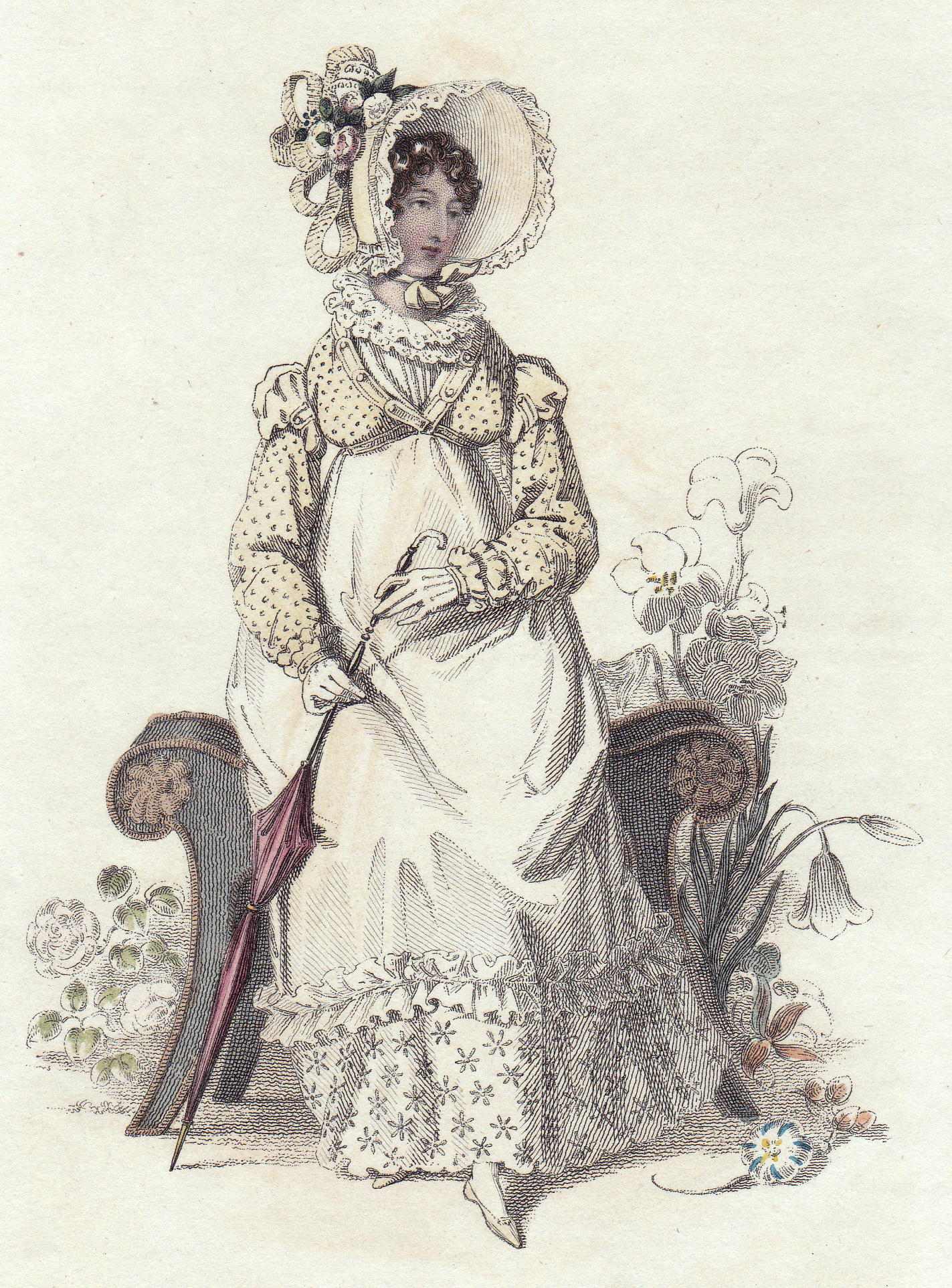 I have a large collection of original fashion prints 1795-1825. All right, I admit it, an indulgently large collection and a bit of a fashion print habit. But having so many does allow me to notice trends I wouldn’t normally spot – how the way long evening gloves are held up changed, how fans were held – and, something that has mystified me ever since I first saw it – the way parasols were carried.
