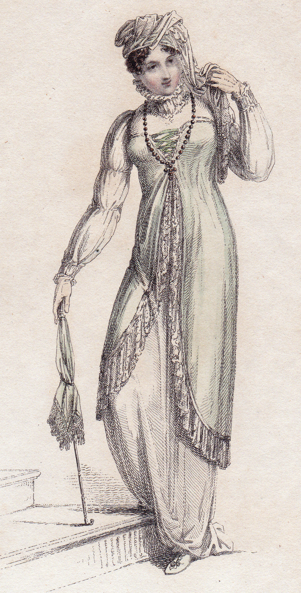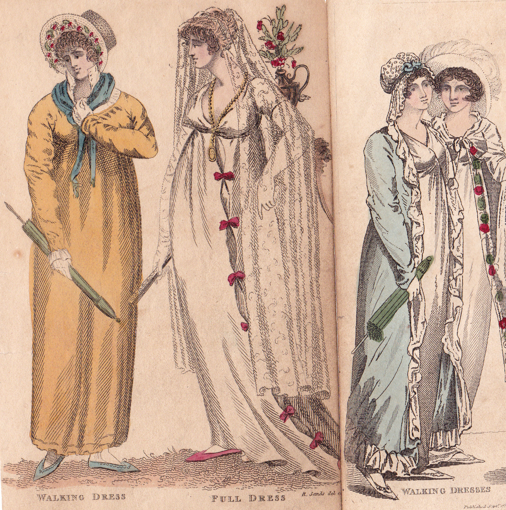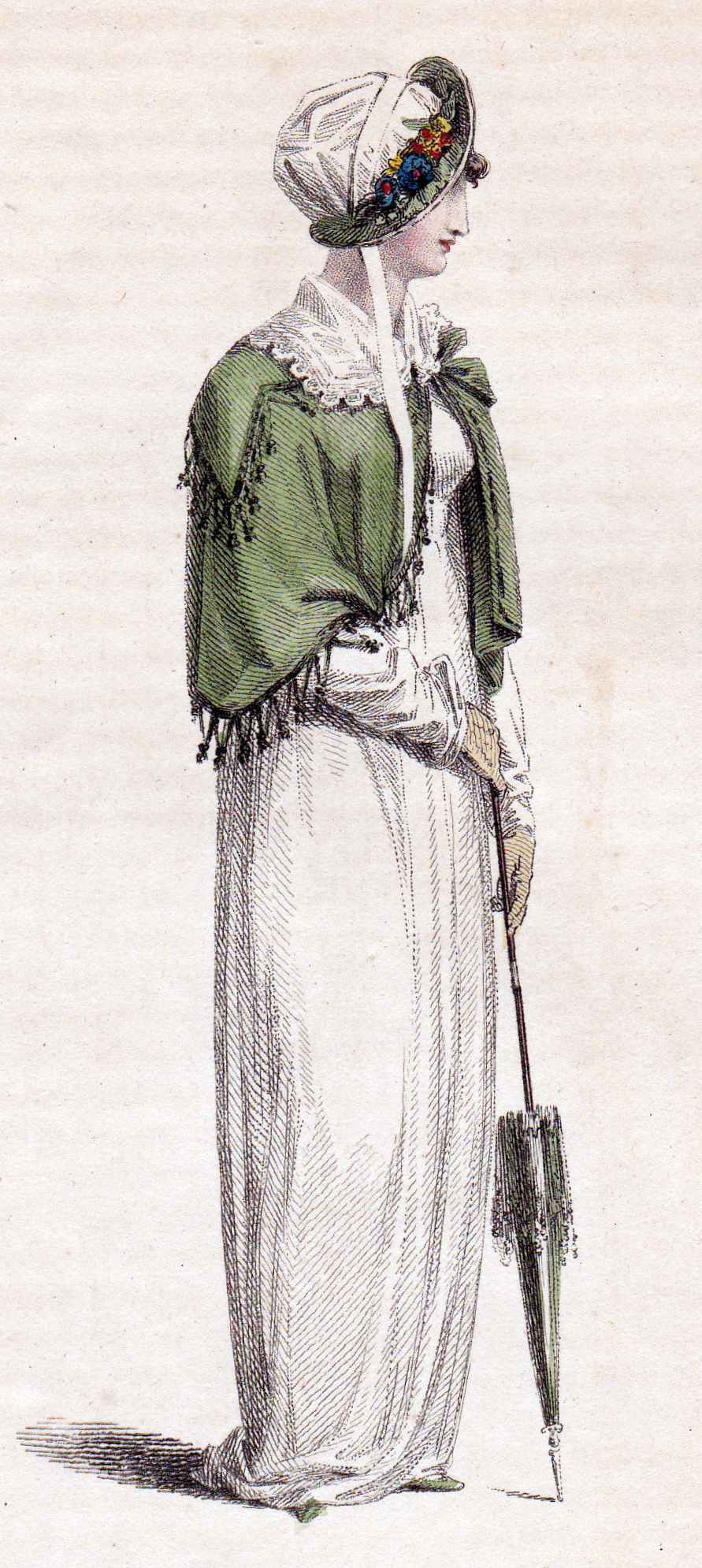 I have a large collection of original fashion prints 1795-1825. All right, I admit it, an indulgently large collection and a bit of a fashion print habit. But having so many does allow me to notice trends I wouldn’t normally spot – how the way long evening gloves are held up changed, how fans were held – and, something that has mystified me ever since I first saw it – the way parasols were carried.