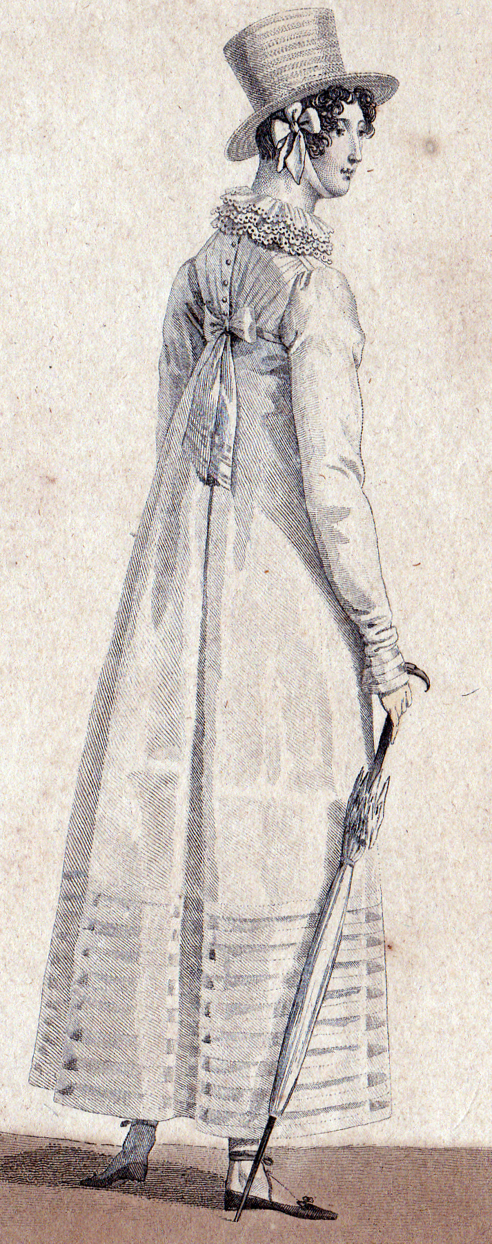 These days we carry our umbrellas (and parasols, if we have them) by the curved handle which finishes the long shaft. At the other end, protruding from the top, is a short extension of the shaft ending in a metal ferrule to protect it when it touches the ground.  The lady wearing a Walking Dress in this print of July 1819 (Ackermann’s Repository) is holding her parasol in this way (Note the ring around it to keep the folds under control).
