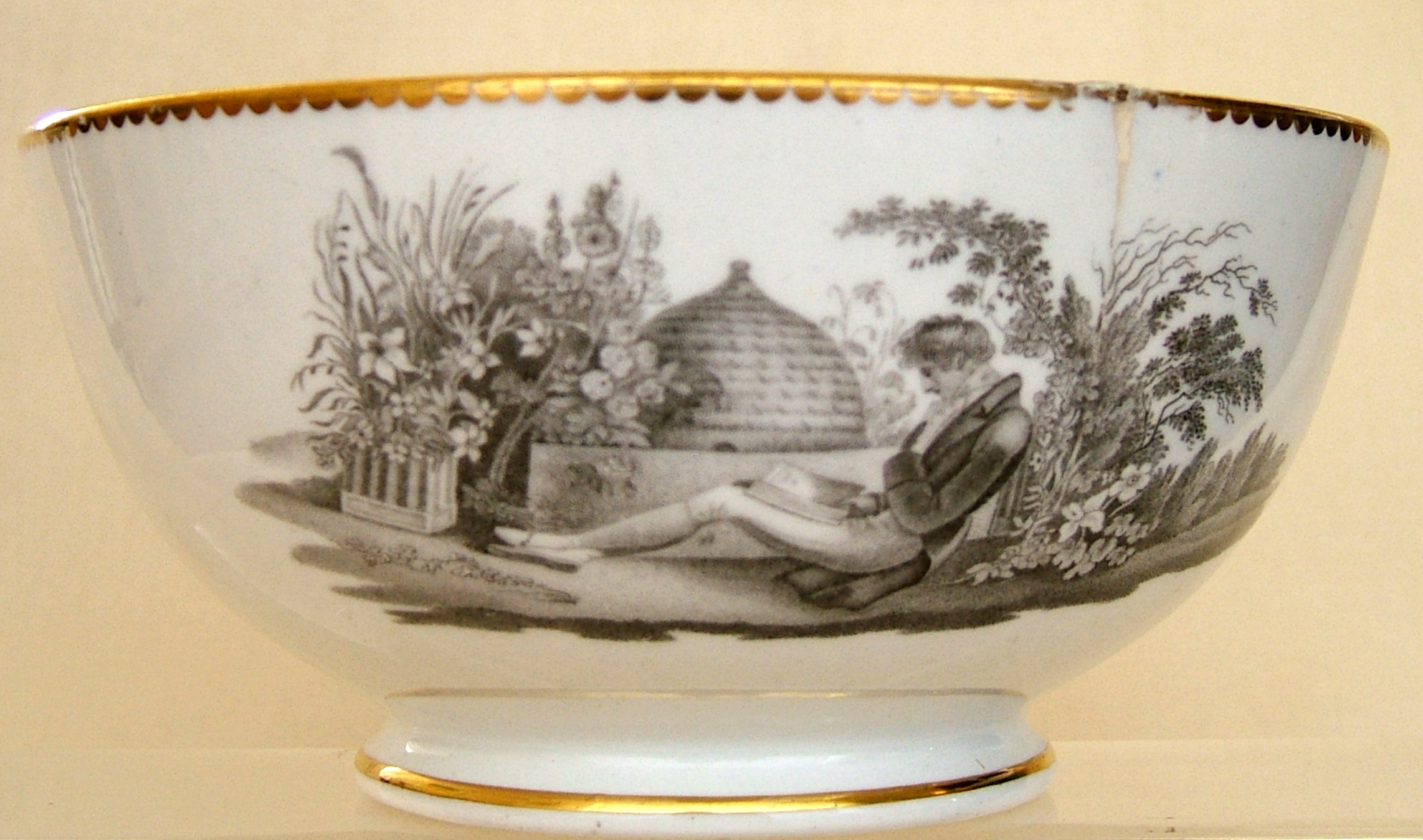 No doubt the elegant gentleman at the foot of this post would have satisfied his reading habit from one of these libraries. (He is sitting in his garden with a large bee skip in the background and is one of my favourite designs from my collection of bat-printed table wares. Bat printing refers to the method, by the way, and has nothing to do with flying mammals!)