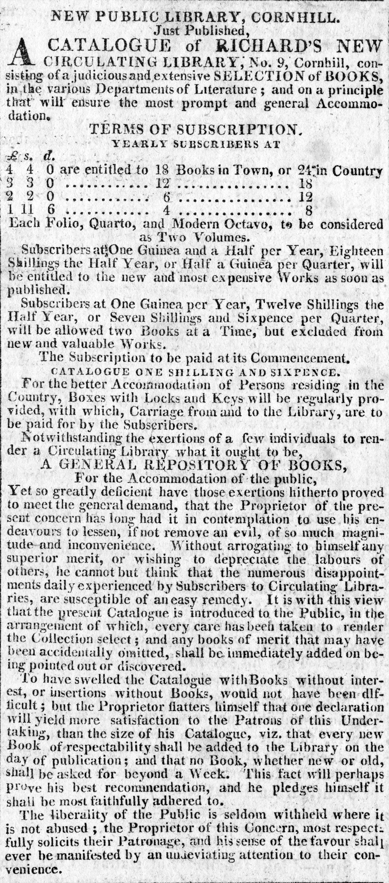 Circulating libraries advertised regularly in all the London newspapers and the advertisement here is a particularly detailed one from a new firm, Richard’s of 9, Cornhill and shows the subscription costs which varied between Town and Country. Special boxes were provided for the transport of books out of London, which was at the cost of the subscriber. Imagine the excitement of a lady living in some distant country house when the package arrived with one of the two books a month her subscription of 4 guineas had purchased!