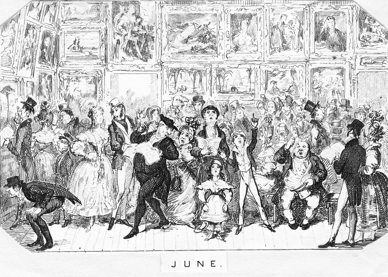 For the first of June here is another of Cruickshank’s delicious drawings of London life month by month. It shows the Royal Academy’s Summer Show with the gawping crowd of connoisseurs, fashionable types and sightseers, all jammed in to look at the pictures hung floor to ceiling in the fashion of the time. This was one of the major events in the London Season and has been held every year since 1769.