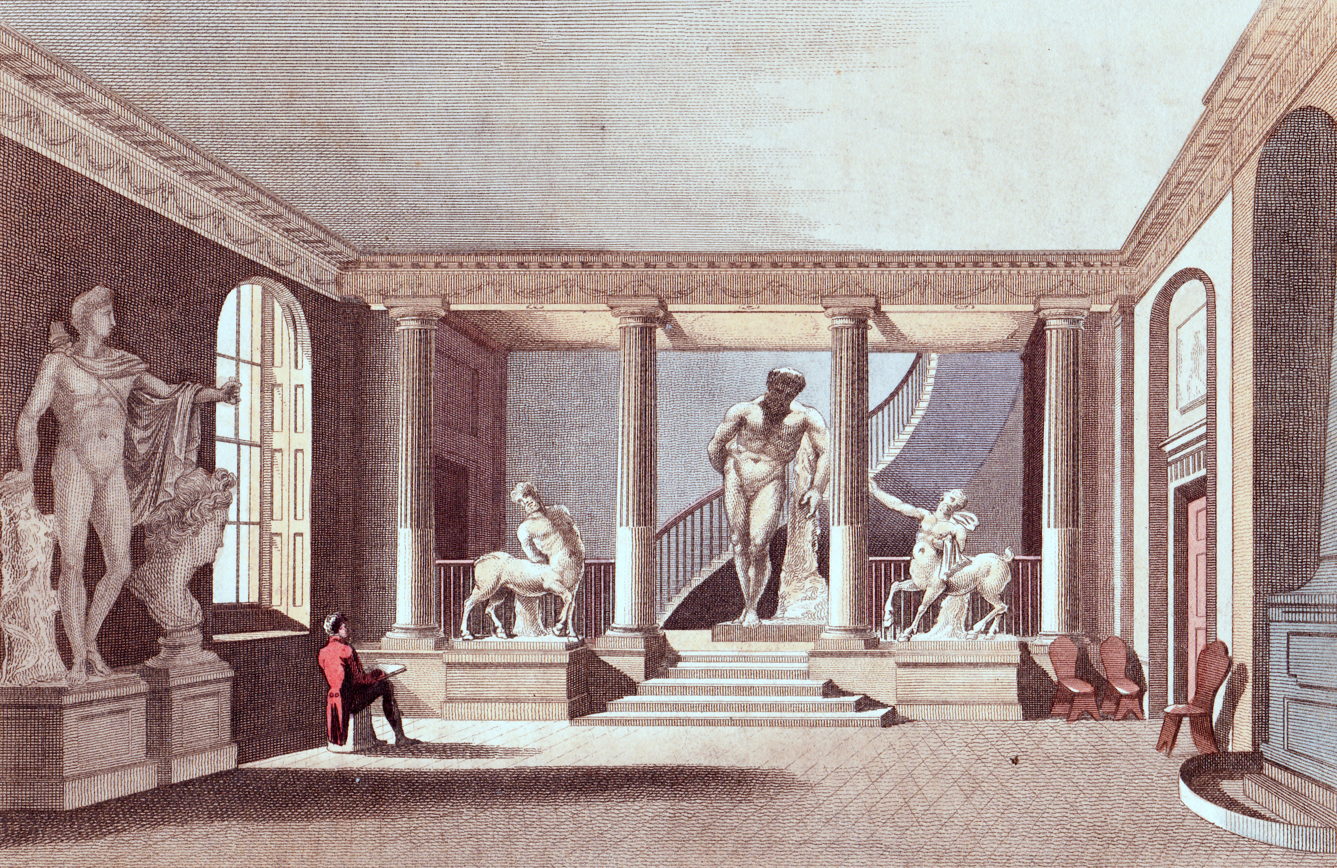 The Royal Academy was initially located in Pall Mall, then moved in 1771 to the first completed wing of New Somerset House, in the Strand. In 1837 it occupied the east wing of the recently completed National Gallery in Trafalgar Square and in 1868 it moved to its present location, Burlington House, Piccadilly. The plate below from Ackermann’s Repository for May 1810 shows the “Hall at the Royal Academy, Somerset House” with an artist sketching one of the plaster casts of Classical statues.