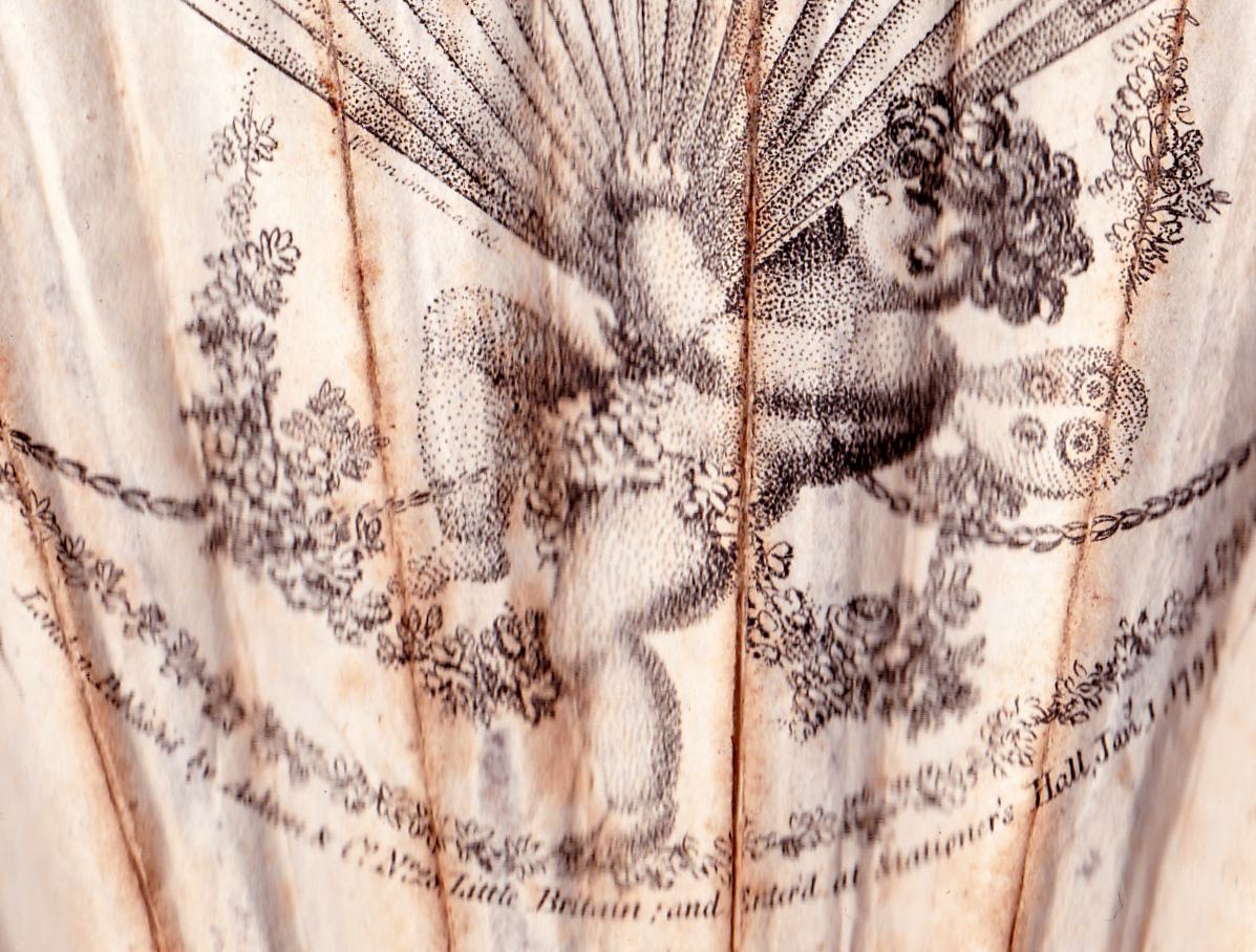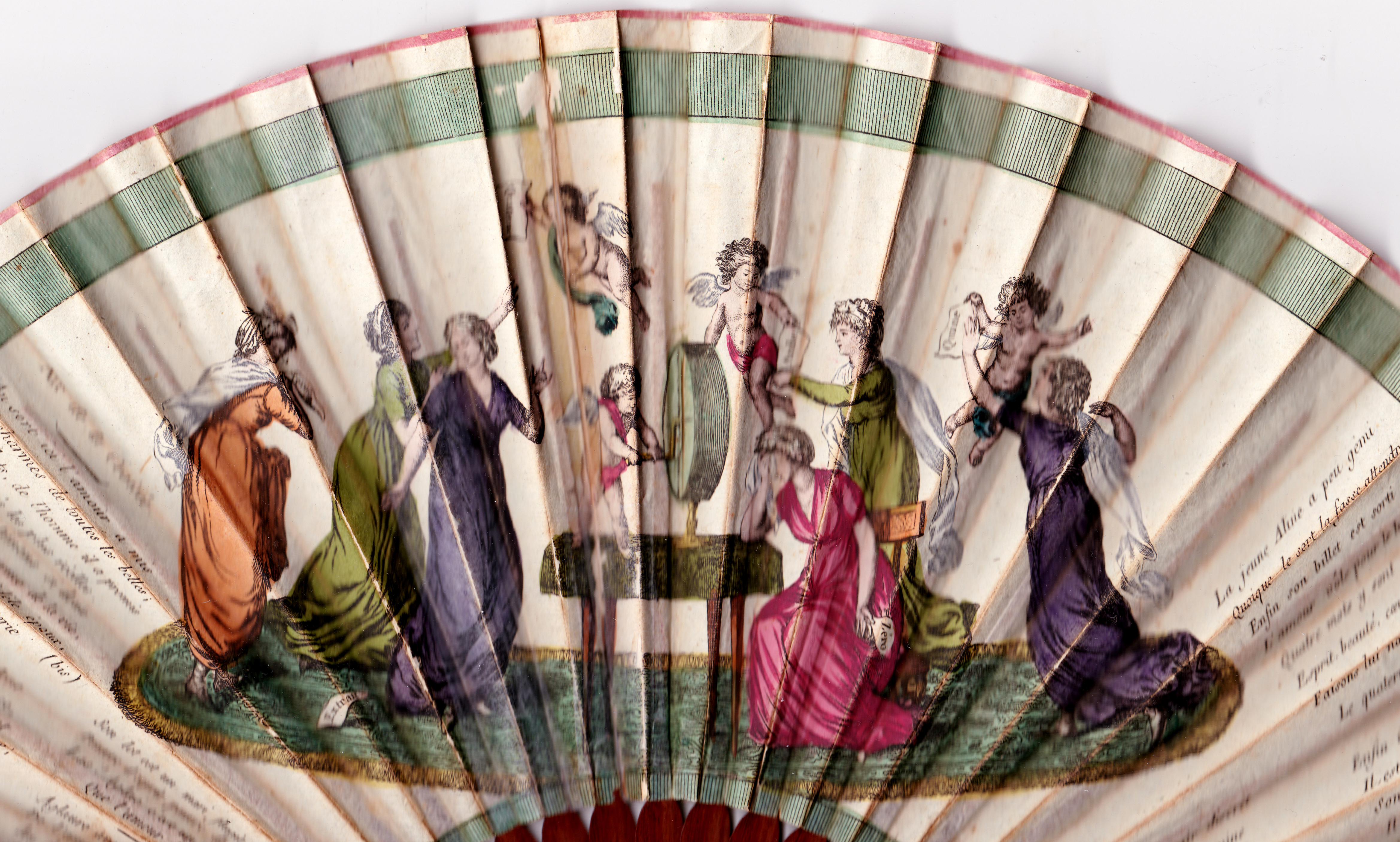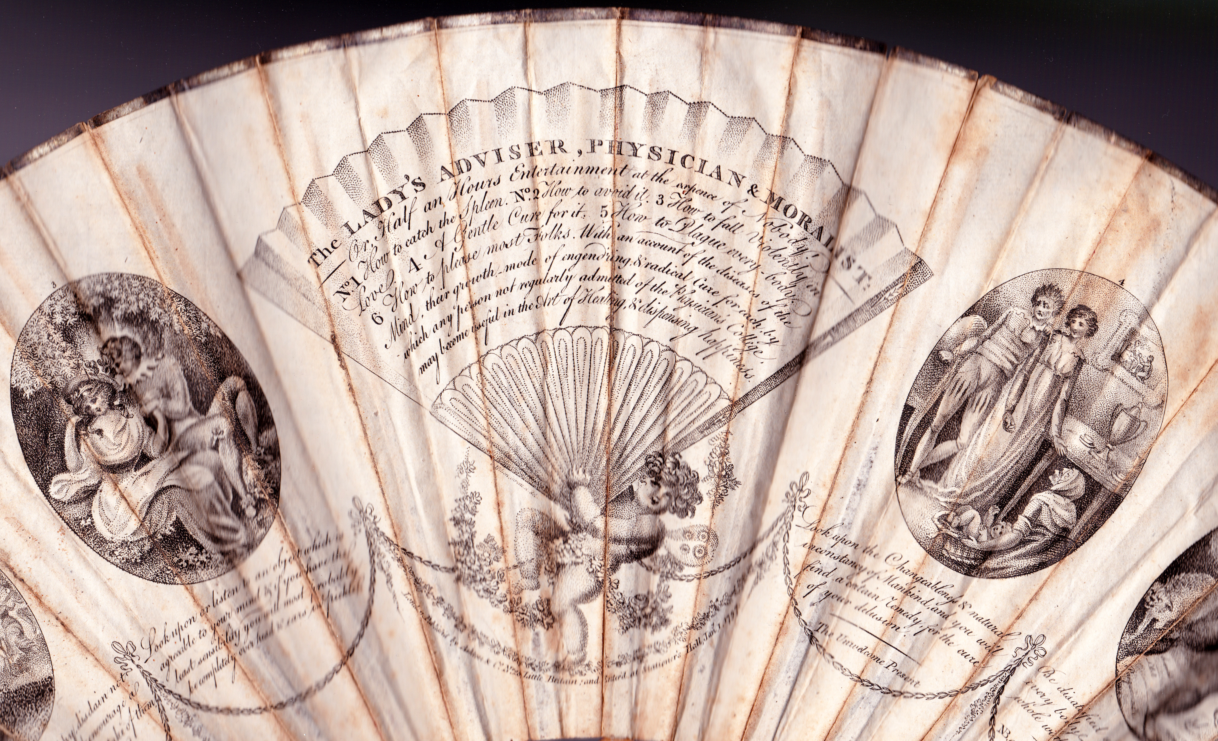 To counter all that intense romance I’ll end with a rather more cynical view of life and love with a fan produced in 1797. It was doubtless intended to be a conversation piece. The central text, shown on a fan held up by a fat little Cupid, explains that this is:
