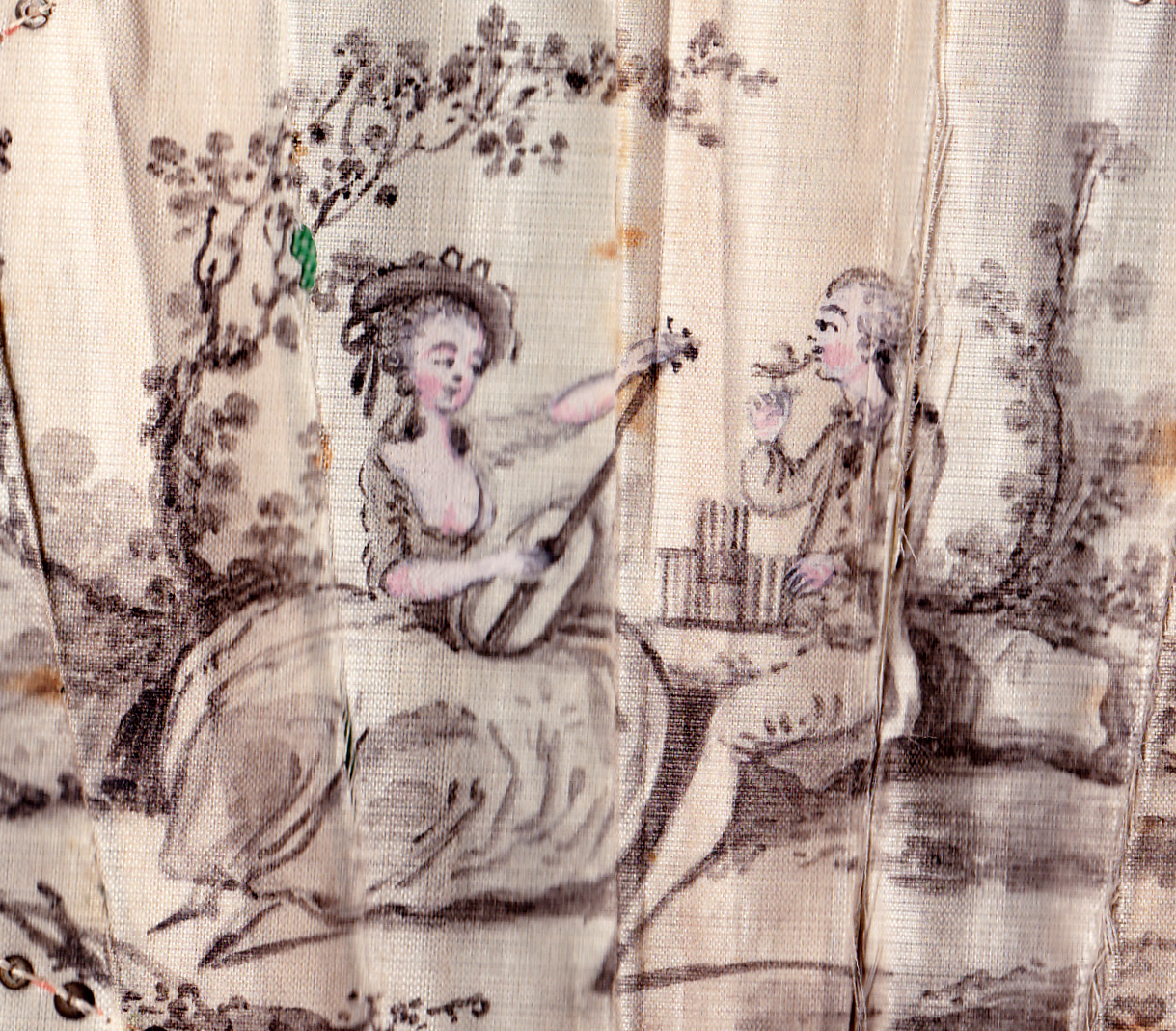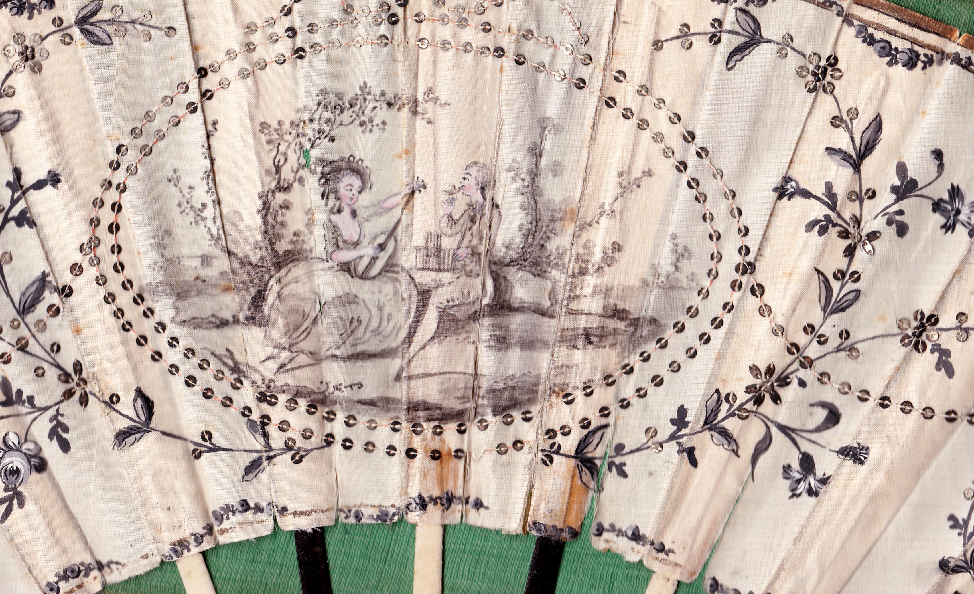 The earliest – perhaps 1770s – is a simple fan with widely spaced black and white sticks. The leaf is painted on one side only in black, white and grey, with tiny silver sequins sewn through the pattern. The man and woman in the centre have delicate touches of pink on their cheeks, hands and on her bosom. This is a very informal outdoor scene. She is playing a guitar and perhaps singing a romantic song. He is sitting with his legs astride the bank, and raising a small bird to his lips, apparently to kiss its beak. A love bird? From their intense exchange of looks it is quite clear that hers are the lips they would both wish he was kissing.
