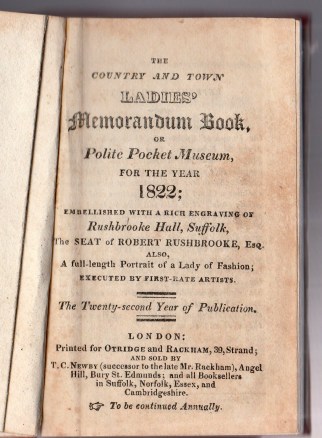 As the frontispiece says the diaries were sold by a Bury St Edmund’s bookseller and throughout East Anglia the choice of a Suffolk house was probably for marketing purposes. Perhaps Elizabeth received it as a gift from a friend or relative.