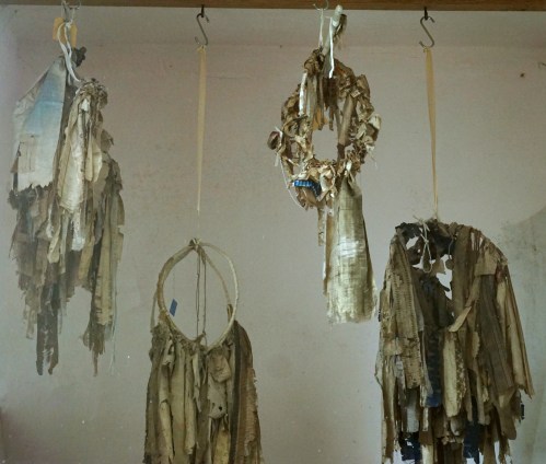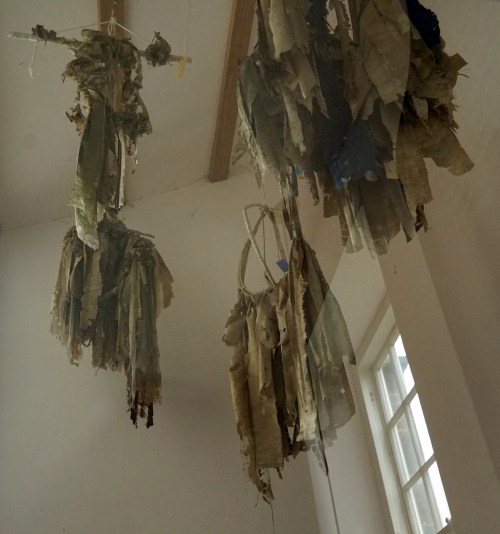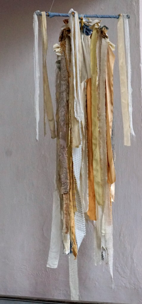 I had no idea that such things might survive, but I recently visited the church of St Stephen in Fylingdales, North Yorkshire and found some there, hanging ghostly in a glass enclosure. (Photographs above and below. Unfortunately the glass enclosure made it impossible to avoid some reflections.)