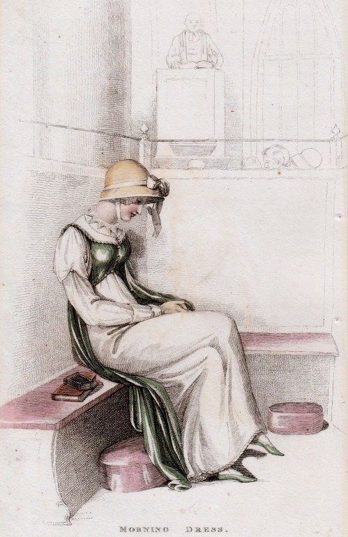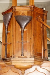 The Rowlandson print shows pews with relatively low sides, but many were introduced with sides so high that only the vicar from his raised position could see into them – these were called box pews, enclosed spaces where the churchgoer could focus entirely on what was being said without distraction from others in the congregation. The print of October 1810 in Ackermann’s Repository [above] shows an attentive listener in her box pew. Hearing what was said was crucial and, as a charming reminder of that, the ear trumpets used by an early 19th century vicar’s wife can still be seen hanging on the back of the pulpit in Whitby church. [Below]