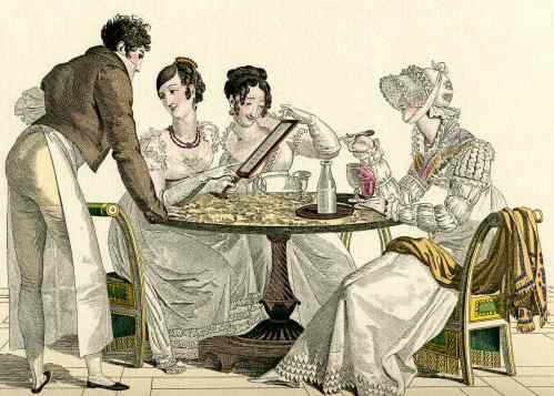 The illustration of the three young women is French, from Le Bon Genre series of the early 1820s. It is called L’Embarras du Choix, although the lady on the left seems more interested in staring at the handsome waiter than choosing her ice cream from the menu!