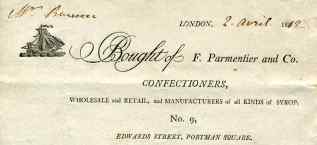 He uses jams and cordials extensively as flavourings for his ices and it was possible to buy syrups ready made. Here is the billhead for F Parmentier & Co. Confectioners of 9, Edwards Street, Portman Square for 1812. The purchaser had bought a bottle of orange syrup for 7 shillings, another of lemon at the same price and rout cake at 4 shillings.