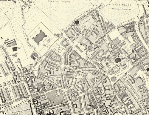 Right at the top edge of the map you can see ‘Bagnigge Wells’ and ‘New River Company’. This area was part of a complex of springs, pools and reservoirs that stretched between Clerkenwell and Islington and included amongst several others, the Peerless Pool, Sadler’s Wells, Islington Spa, the London Spaw, Merlin’s Cave and Coldbath spring. The Cold Bath building can be seen in Cold Bath Square immediately to the SE of the prison.