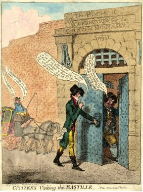 The cartoon (1799) shows ‘Citizens Visiting the Bastille’ although The House of Correction for the County of Middlesex is clear over the gateway, as are the bunches of fetters on either side.