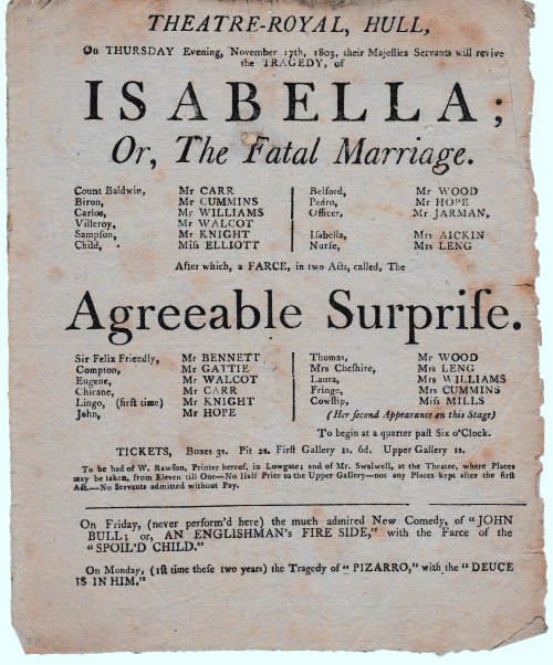 My next playbill is for December 1804, the next season and, irritatingly, it does not give prices for tickets – I was hoping to see if Mr Wilkinson was reducing them in the face of criticism. It is, however, a benefit performance in aid of Mrs Wilkinson, one of the actors and, I assume, John’s wife.