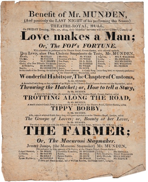 As well as the comedy there are five comic songs – all with mentions of the Theatre Royal, Haymarket, as if to add lustre to the programme – and a musical farce: The Farmer; Or, The Macaroni Staymaker. The name of the stay (or corset) maker is Jemmy Jumps and for an explanation of stays, corsets and jumps, please see the post immediately preceding this one. Unfortunately I cannot locate any of the script of that one – I would love to see some corset jokes!
