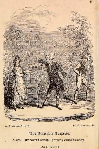 The tragedy, Isabella, or, the Fatal Marriage was an immensely popular work by Thomas Southerne, first performed in 1694. Isabella, mourning her dead husband Biron, is ravished and marries Villeroy. Then Biron reappears, is murdered and Isabella kills herself. To cheer the audience up after that is The Agreeable Surprise, a farce by John O’Keefe. The image below is from a later edition illustrated by Cruickshank and shows the dairy maid Buttercup with the character of Lingo in the centre.