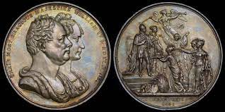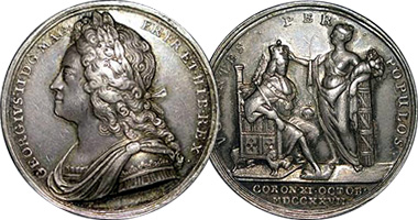 George and Queen Caroline were crowned 11th October 1727. Caroline’s gown was heavily encrusted with jewels – so heavily, in fact, that a pulley system had to be installed so that she could kneel down. As she had to do this several times in the course of the ceremony I am disappointed that I can’t find an image of this. It can hardly have added to the dignity of the occasion. The Coronation medal shown below clearly depicts the throne that will be used again for the coronation of Charles III.