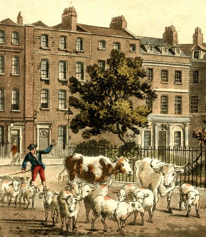 A glimpse into the state of the London streets, with vast herds of livestock being driven through them daily, is captured in the report that, “On Friday-forenoon, a large bullock that ran from a drove in Newgate-street, ran into the shop of Messrs. Baldwin & Co. booksellers, and the parlour door being open, he walked in, where there were three or four ladies sitting who were very much frightened…they were at length rescued… by a drover…all the furniture had to be piled in one corner to make room for the animal to turn around: he then walked out very deliberately.” The picture shows a detail from a print of Soho Square (Ackermann’s Repository 1812)