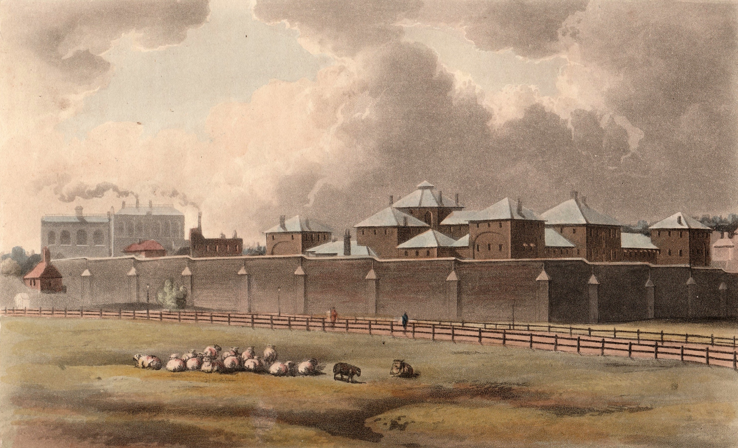 “The edifice, which is of brick, stands within a large area, encompassed by a strong buttressed wall of moderate height. The gate is of Portland stone, contrived in a massy style, and sculptured with fetters, the hateful but necessary appendages of guilt.”