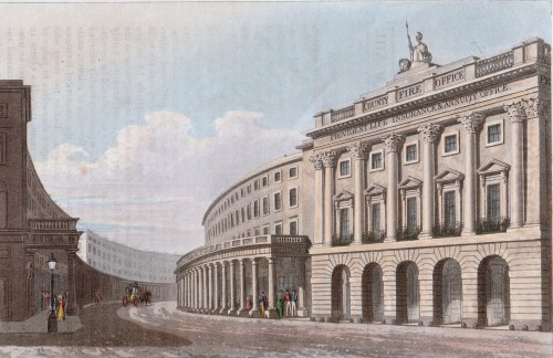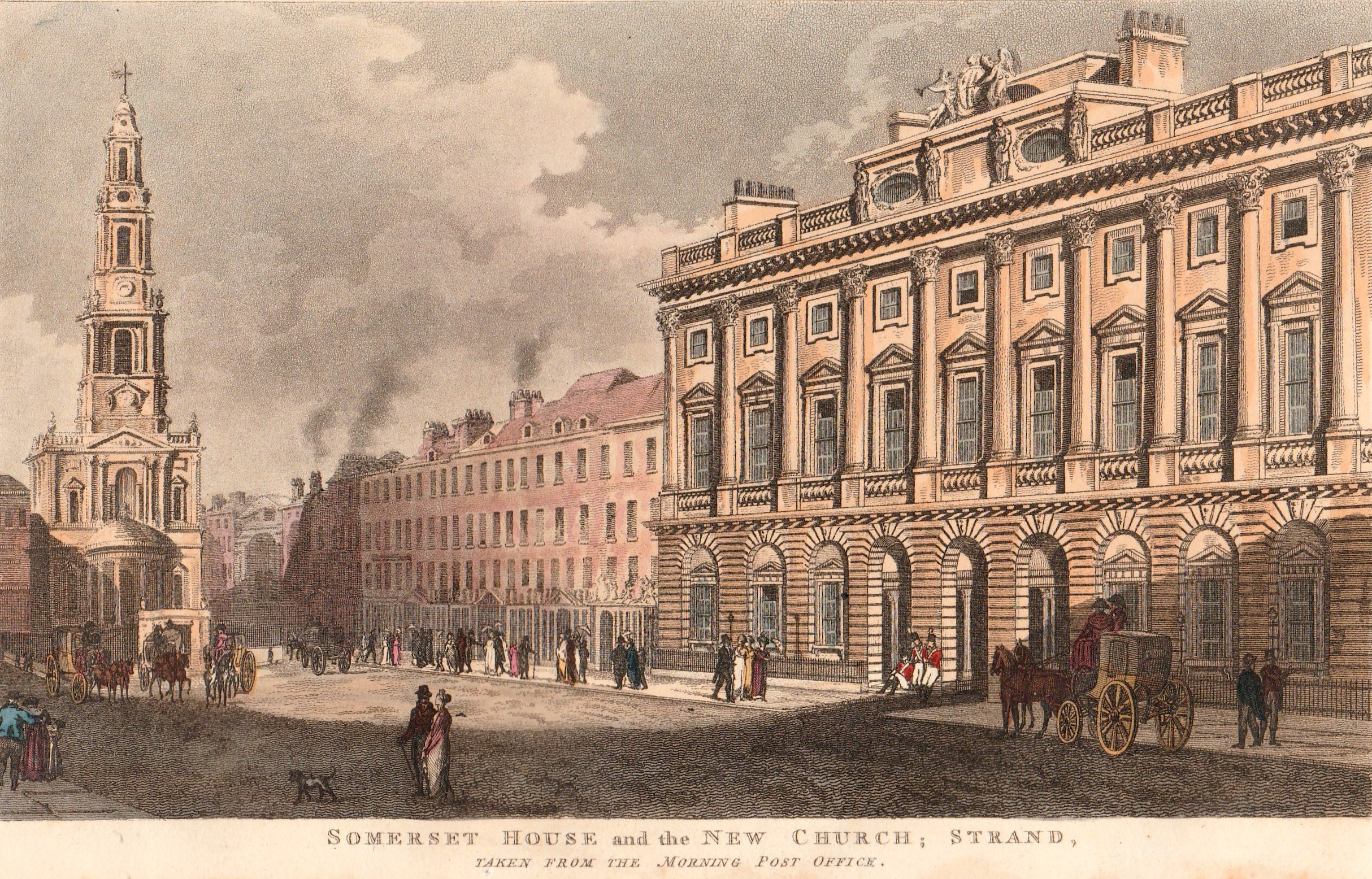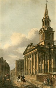 The print, from Ackermann’s Repository, shows the view looking back the way they had come. We are facing down the Strand with Northumberland House (demolished 1874) on the right. The site of Trafalgar Square is over our left shoulder and Whitehall runs off to the right. The statue is the only landmark we would recognise today – King Charles I looking down towards his place of execution. I blogged about it more extensively here.