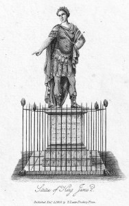 The Cruikshank print is entitled Monstrosities of London (1822) and it is the dandies and the ladies in their highly fashionable outfits that are being caricatured. The statue already has its fig leaf!