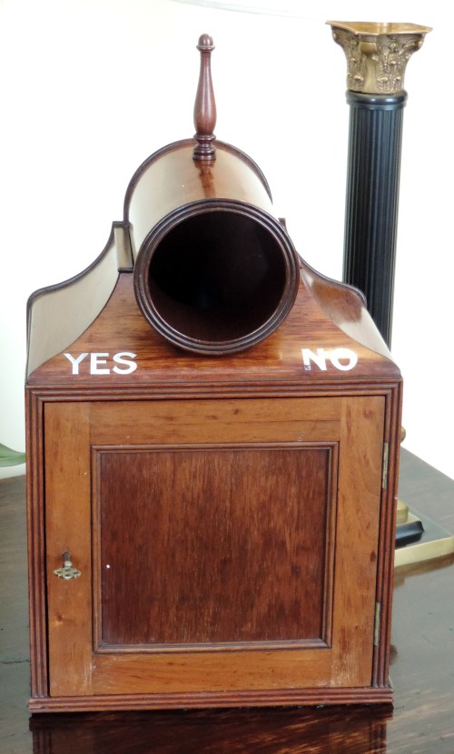 You put your hand into the hole and then drop the ball to either left or right into the appropriate drawer – the ‘sleeve’ is long enough to conceal any movement of your arm which might give away which option you are taking. Once all the members have dropped in their ballots it was simply a case of pulling out the drawers and seeing the result.