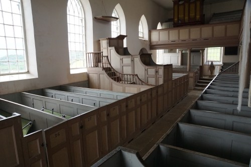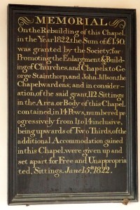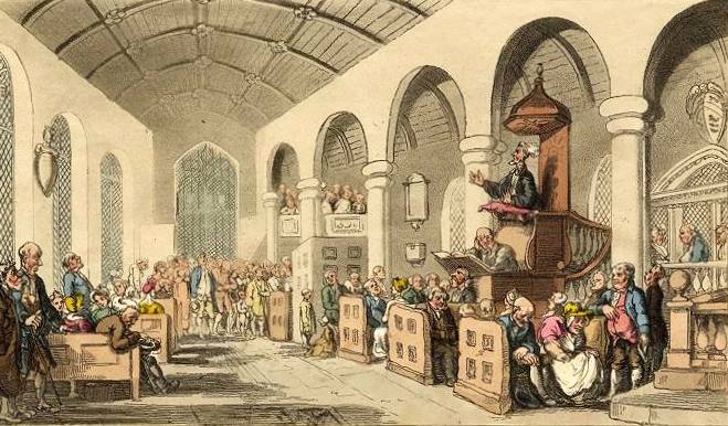 St Bartholomew the Less was a chapel for the priory, built in about 1154. Although ancient, it has had a chequered history. The print below shows the interior as remodeled by Charles Dance the Younger in 1789: the box pews have been replaced. It was heavily restored after bomb damage in the Second World War.