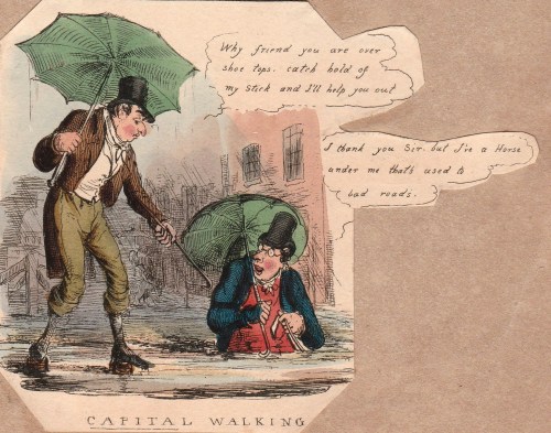 Young men crashing their vehicles was obviously commonplace, and then as now, showing off to the ladies was also part of the joy of owning a sporting vehicle. Alken was not above titillating his audience with a glimpse of petticoat or a shapely leg, even when the owner of the leg was about to get seriously hurt. In “Up and down or the endeavour to discover which way your Horse is inclined to come down backwards or forwards” (1817) the driver takes no notice at all of his fair passenger vanishing over the back of his fancy carriage. There are some nice details in this print – the two-headed goose on the side panel is presumably a reference to the driver not knowing which way he is going and the luxurious sheepskin foot rug is clearly visible.