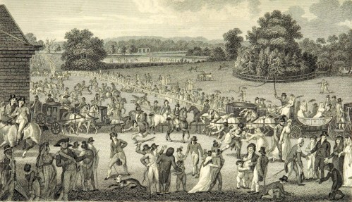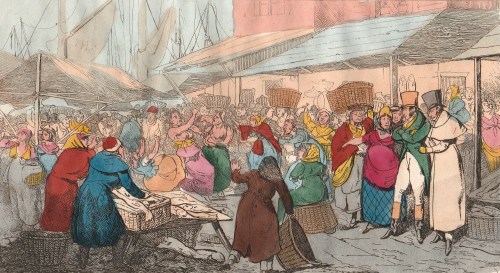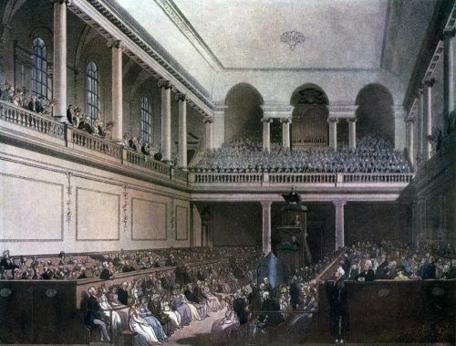 The Auction Mart, situated in Bartholomew Lane, right next to the Bank, was completed in 1810. According to an article in Ackermann’s Repository of 1811, from which these two images come, ‘Its object is to facilitate the sale by auction of every species of property, and to promote the circulation of intelligence relative to that subject.’ It contained auction rooms and also suites of offices for brokers and merchants, and a coffee room. I have included images of both the coffee room and the hall because this is a place one rarely sees illustrated – and for the contrast between the studious young gentlemen in the coffee room and the jovial and portly gents in the hall.